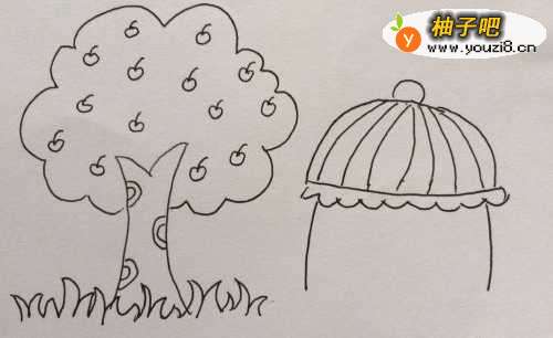 5接着我们在果树的傍边再画一个小屋子;先画一个半圆的屋顶。