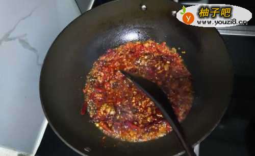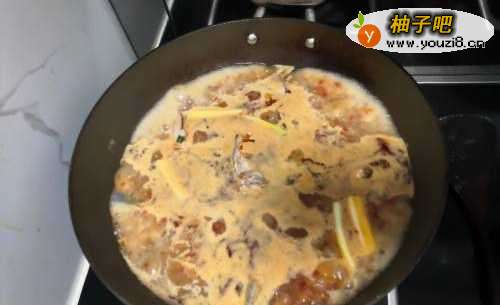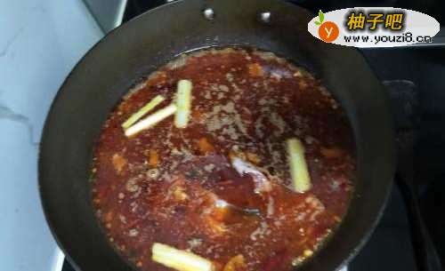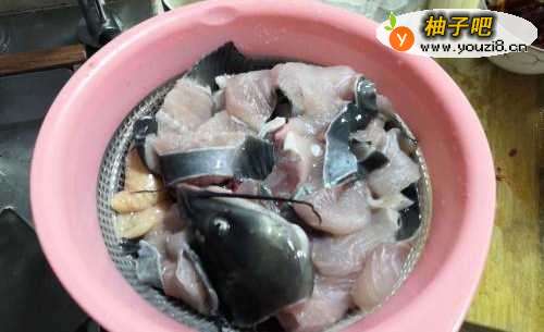 7往锅中慢慢放入鱼,先放鱼骨部分。