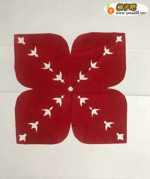 6第六步 涂实完大雁之后 再从中心点的对立角上弯曲着剪一条圆弧线 然后再剪去每一只大雁的轮廓部位 最后整理一下 一副简单漂亮的大雁纹样图案就剪完了