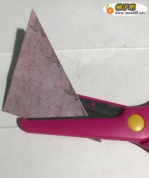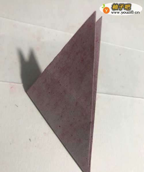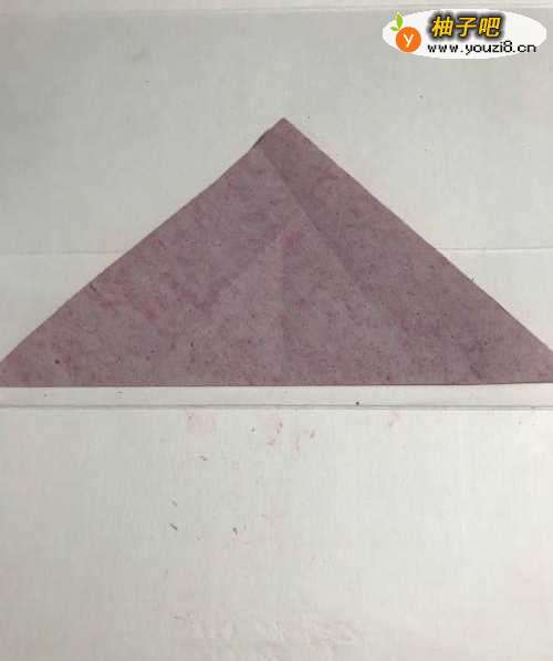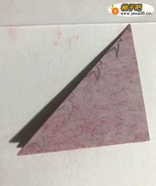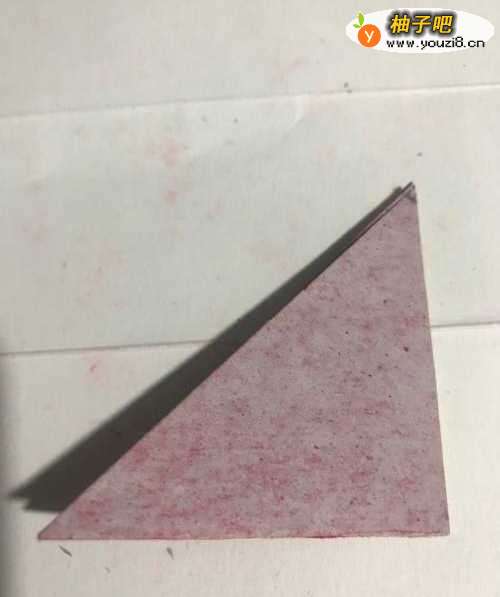 第一步 首先取一张长度为16厘米 宽度同样是16厘米的正方形红色彩纸 把它从下向上对角折叠整齐