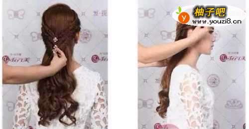 4第4步、拉至中间绑定后再佩戴好精美的插针,在侧区也要佩戴好精美发饰,一款绝美的长发编发发型就ok啦!