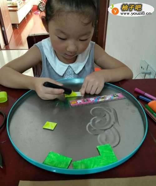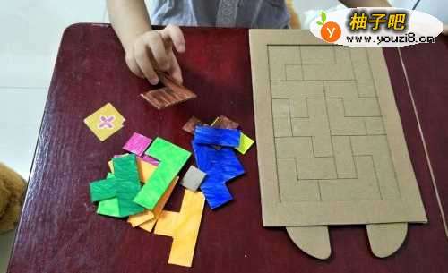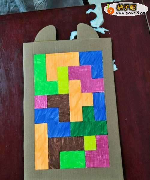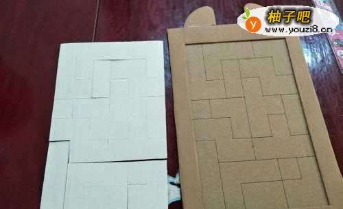 7按需要均匀分格,把分格后的距离划在底板上,用于之后好拼,上面一块板上贴上白纸,为之后好上色,然后按自己喜欢做俄罗斯(白纸也可以换成图案卡纸)