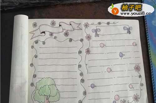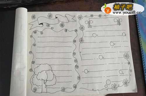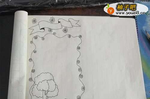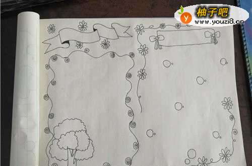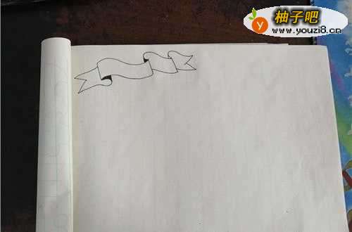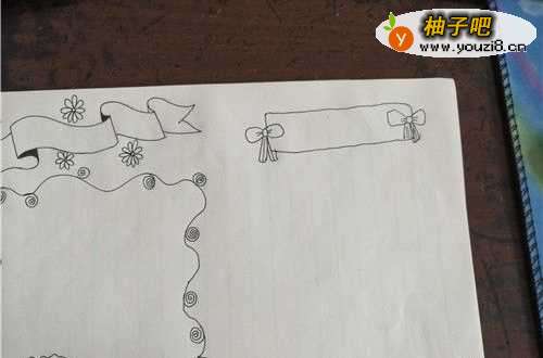 首先准备好绘画的用具,先在纸上画上飘带样子的标题栏。在标题栏的周围画上几朵小花,如图二。