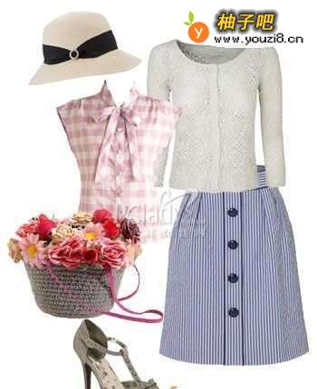 1方格衬衫+手工编织外套+条纹棉布裙。还记得方格衬衣的青涩还有条纹半身裙的清爽。甜美的记忆似乎只在淡雅干净的色调中重温。柔美的色彩鲜花一样的年龄,还有祖母手工编织的外套哦!