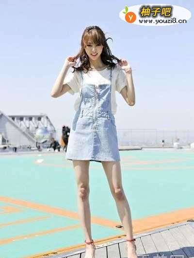 3搭配技巧:简单的白色T恤巧妙的搭配浅色背带裙,配双红色的坡跟凉鞋很抢眼。小清新的味道十足,非常有文艺范儿,有种邻家女孩的感觉呢。