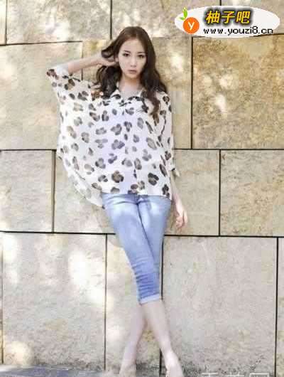 4这款豹纹蝙蝠袖衬衫,看似狂野,其实挺小清新的。飘逸的雪纺面料,混搭牛仔五分裤,多了几分知性优雅的味道。