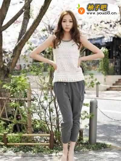精美的白色蕾丝背心搭配灰色宽松裤,松垮的版型更显随意范儿。背心领部采用金属珋钉装饰,而蕾丝正好中和了珋钉的朋克味道