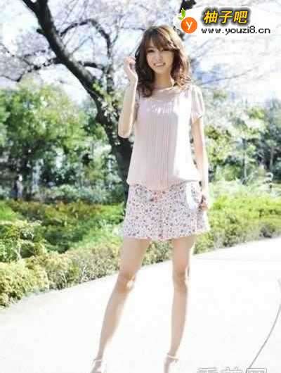 2轻柔的裸色短袖雪纺衫,胸前自然的褶皱正好凸显女性的柔美,搭配素雅的碎花小短裙,清新感十足,特别美。