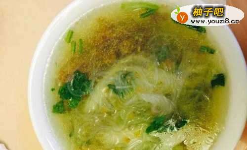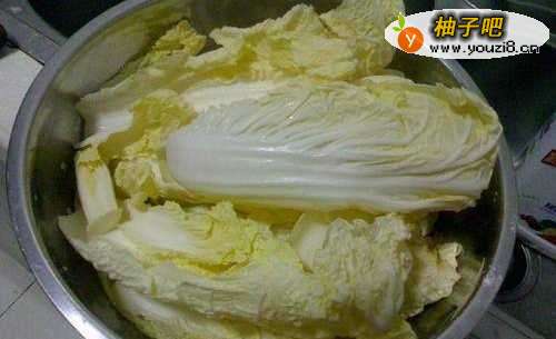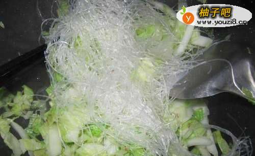 4锅内加水烧开后,依次加入白菜、粉丝,煮一分钟后转中火,再煮五分钟后,加入适量盐和鸡精;