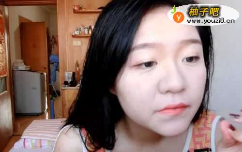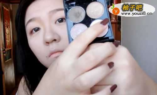 6然后,再选择稍浅一点的粉底饼,用手指点沾,涂抹在眼帘上(眼皮上方),画眼影来衬托增加眼睛的亮度,用手轻轻涂均匀即可。
