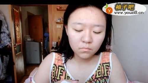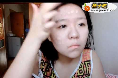 3再用同样的方法,将粉底霜点抹在脸部的各个位置,然后先用手指将粉底霜涂抹开,然后再用粉底海绵擦,将粉底霜擦涂均匀。注意可以将自己皮肤有瑕疵(逗疤痕、雀斑等)的地方多擦点粉底霜。