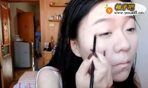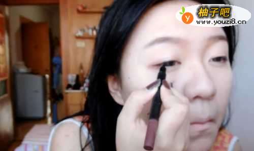5然后,再用较细的眉笔(褐色)画眼角线,注意两个眼角线画的要深浅一致,宽窄一致,不然很容易成鸳鸯眼的。