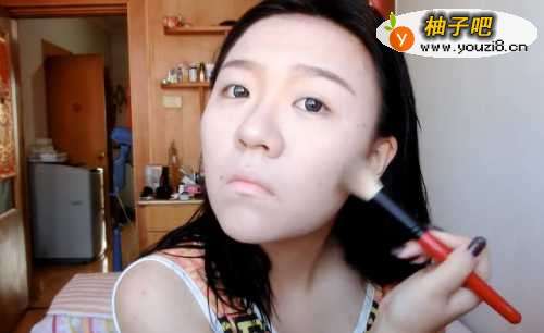 7然后,根据自己的肤色,可以选一点腮红打在脸颊,选一点稍深的粉饼用小刷子刷在鼻夹两侧,然后面部全部扑粉,再用大毛刷将扑粉刷均匀,显得自然就好。