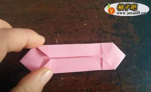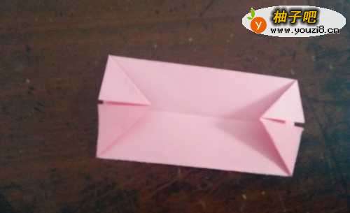 4我们把右侧的角向内折,下边的是左侧的角向内折。然后把中间对折,如图二。