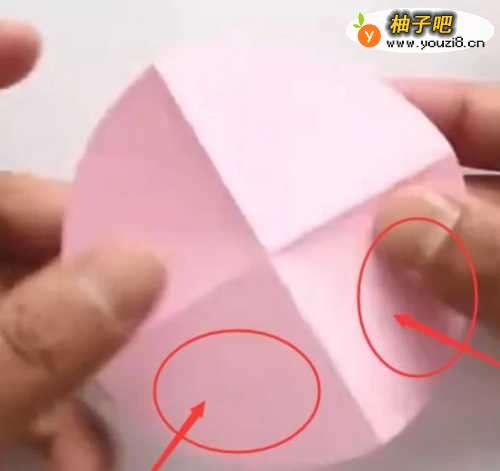 3再打开,现在我们可以看到纸张被分成了四个区域,图中用圆圈标出来两个区域我们进行对折。