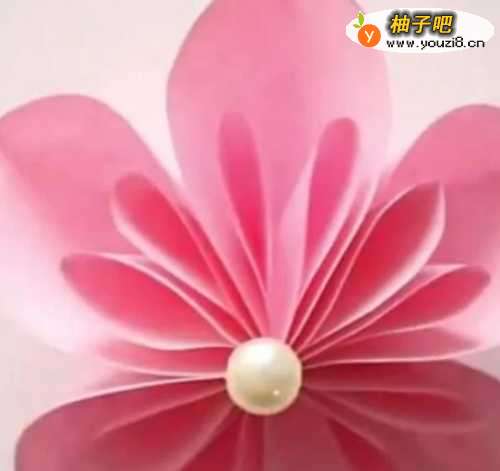 8最后可以在最上面粘一个小的珍珠,这样就完成了我们的纸花手工制作。