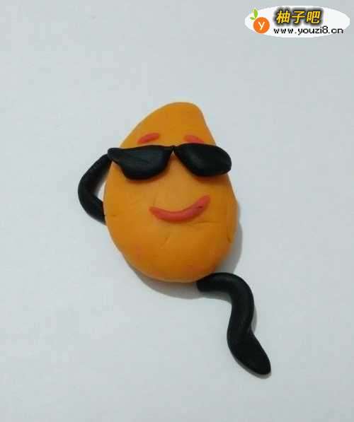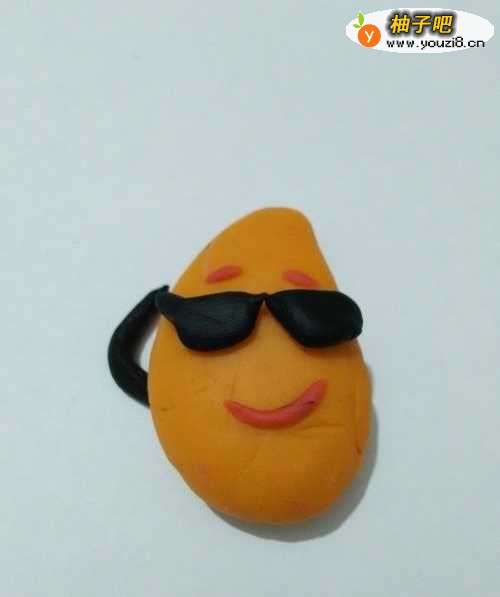 6用黑色搓一个细长条,粘在芒果左侧,当作背在脑后的一只胳膊。