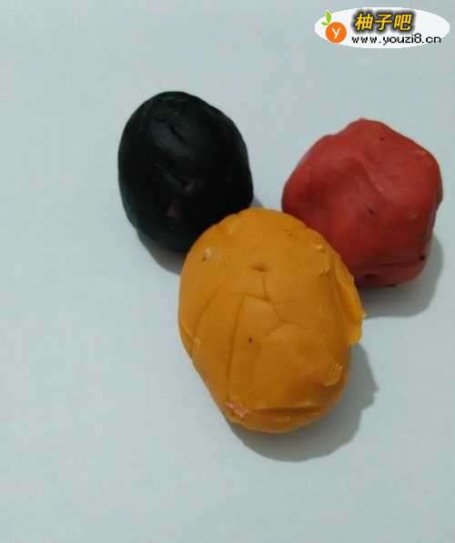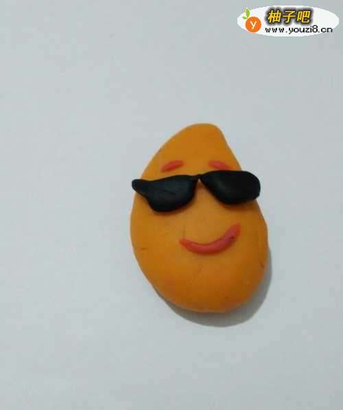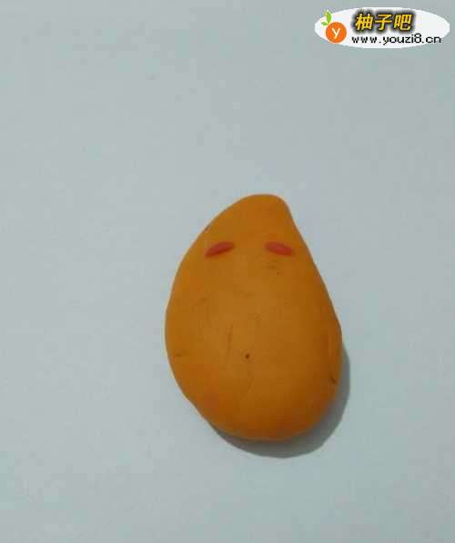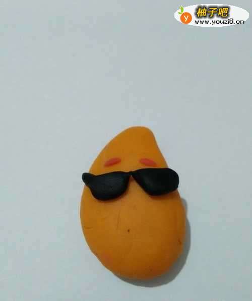 3用两小块红色,搓成极细小的条,粘在芒果上方,当作两条眉毛。
