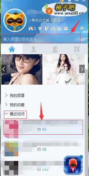 2进入YY频道,可以输入YY频道号回车进入或你想进入以前进入过的平道也可以从下方的“最近访问”双击频道图标进入。