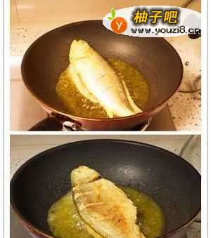4开始炸鱼。待油微微冒烟时,提起鱼尾巴,沿锅边慢慢将鱼滑入。如果害怕热油飞溅,可以盖上锅盖。中火炸1-2分钟,期间可以倾斜锅子,让油炸到鱼头和鱼尾部。接着翻面,将另一面同上操作。