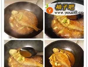 6接着熬鱼。全程保持大火。倒入开水刚好没过鱼身的一半,放入葱姜蒜、各种酱油、醋、冰糖。由于黄鱼肉比较嫩,中间就不翻面了,不断地用勺子将鱼身两边的汤汁浇在没有浸入汤汁的一面,使其入味。待汤汁收到如图右下的样子时可以尝尝汤汁,根据自己口味再行调整。