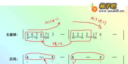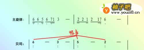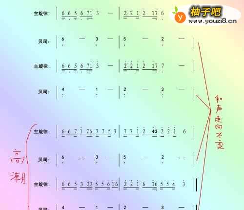 2【学习和声知识】: 通常我们听的歌曲都有伴奏,伴奏就涉及到和声,所以要作一首曲子,还应该兼顾它的"和声走向"。而和声走向中最核心的即是根音走向,在音乐里我们可以把根音理解为贝司弹奏出来的重低音。如仔细听一些流行歌曲,你会发现不同的歌曲里面的和声走向有些是重复的,所以我们也可以照搬别人的和声走向,或加以变化来并为己用。 常用的基本走向有“1-6-4-5- 和 变化之后的1-7-6-5-4-3-2-5-”、“6-2-5-1-/6-3-4-1-/6-3-5-2-”、“1-6-2-5-和1-6-3-6-” 、“2-5-3-6-和4-5-3-6-”、 “6-3-451-/6-3-456-/4-5-176-”等。 其次要了解的就是最基本和弦种类"正三和弦",即简谱中每个音类似于“1、3、5”三个音叠加起来的这种关系,它是伴奏中最常用的。