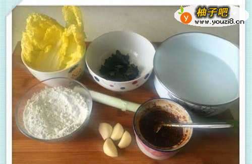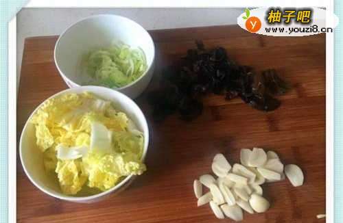 2木耳泡发后切墨罪颂小块,娃娃菜切碎,葱切碎,蒜切片,大葱用少量热油浇一下备用