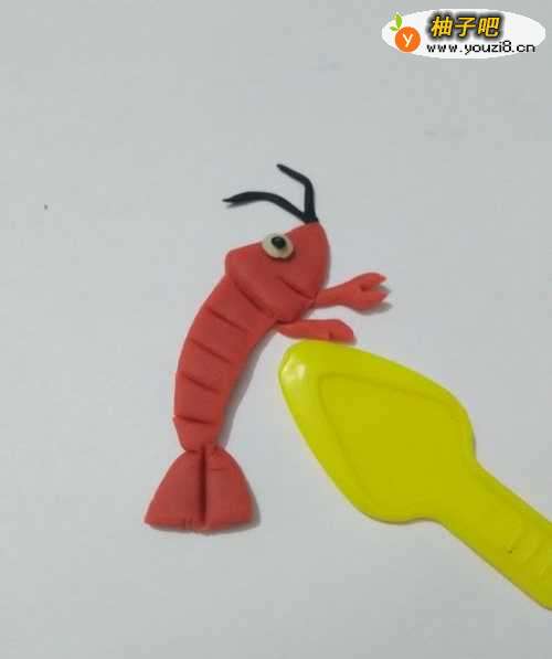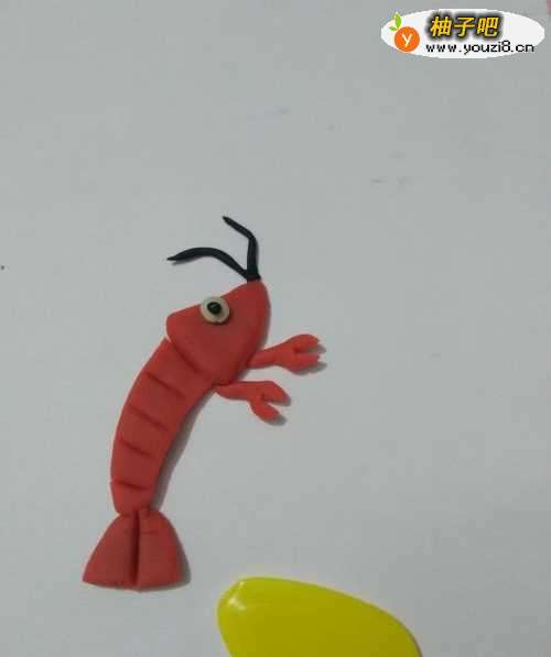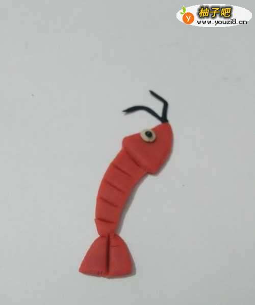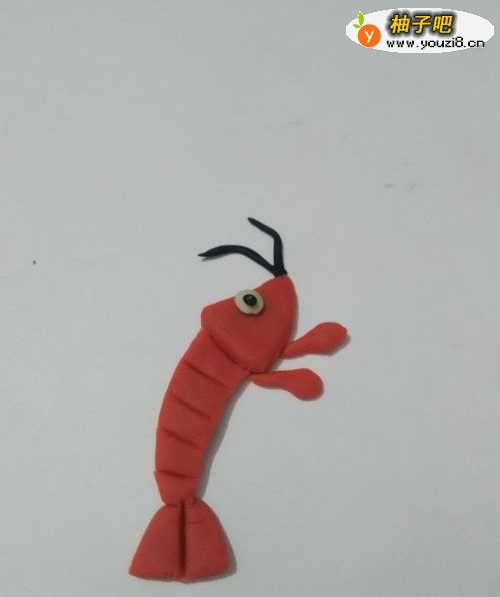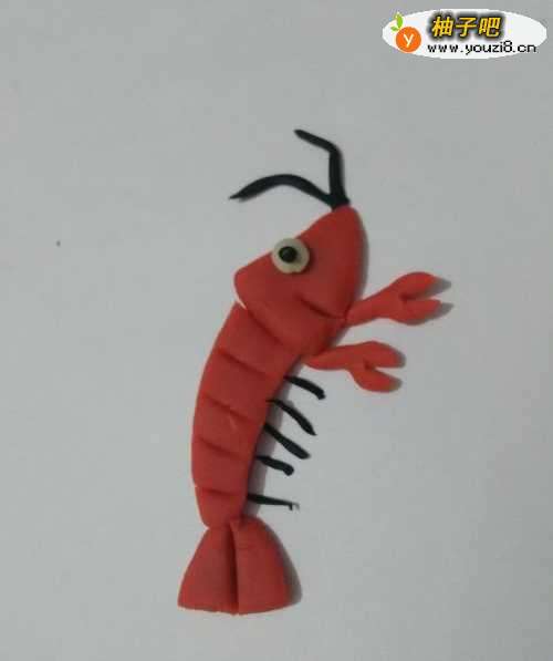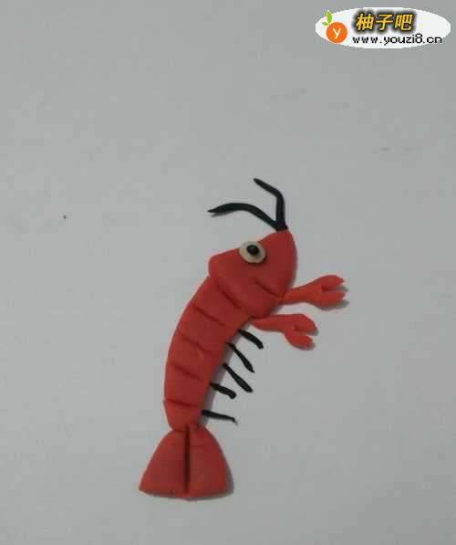 13用黑色搓几个细细的小条,粘在身体右侧,当作身体下面的脚,红色的小龙虾就做好了。