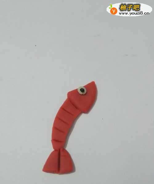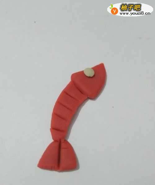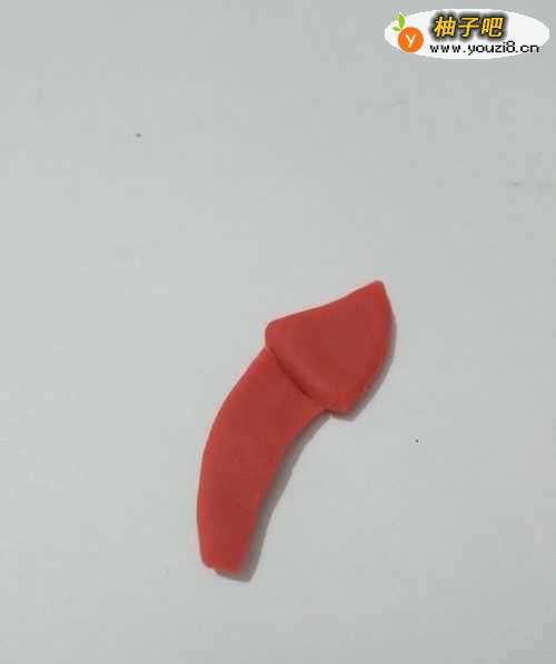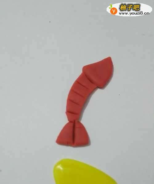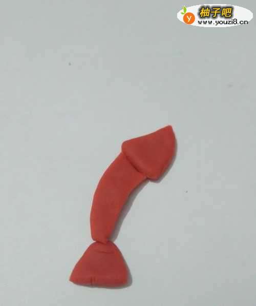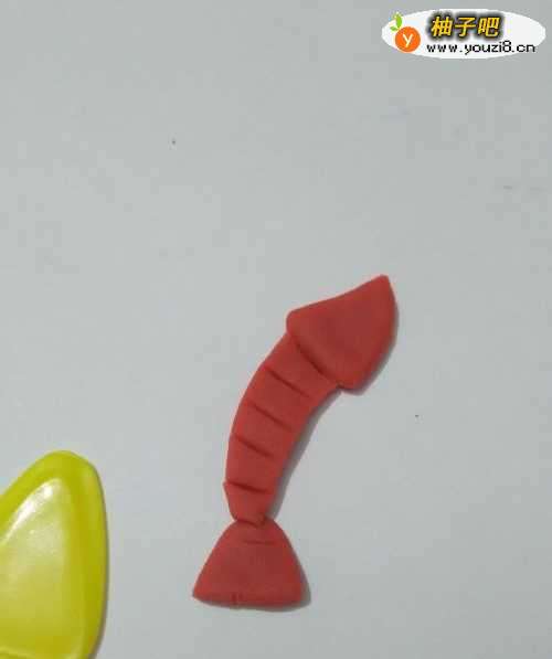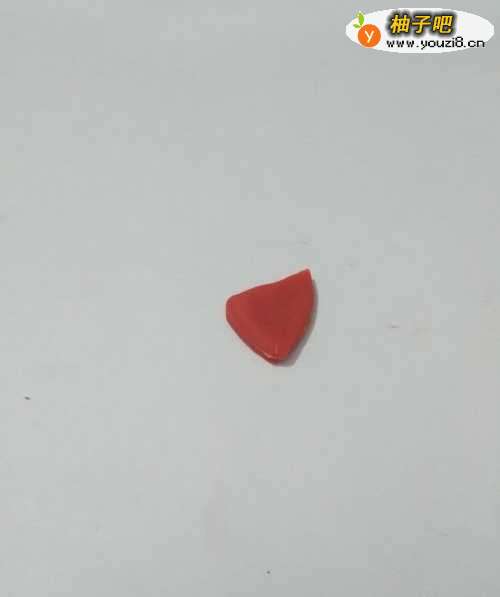 4再用红色捏一个三角形,粘在身体下面,当作它的尾巴。