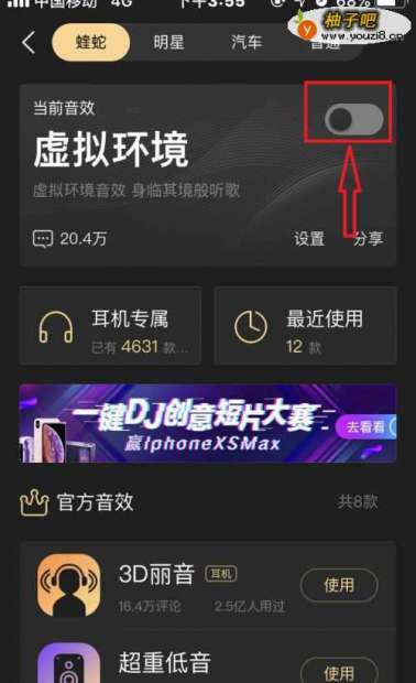 5点击“虚拟环境”,选择虚拟环境模型,即可将虚拟音效应用到歌曲中。