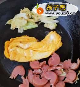 3煎鸡蛋,香肠,蔬菜,准备好,作为卷到荞面摊饼里的食材。