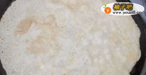2平底锅薄薄刷一层油,倒入混合好的面糊,中小火,看到四周稍微翘起来了,就慢慢晃动平底锅,一面就起来了,就可以翻到另一面了。