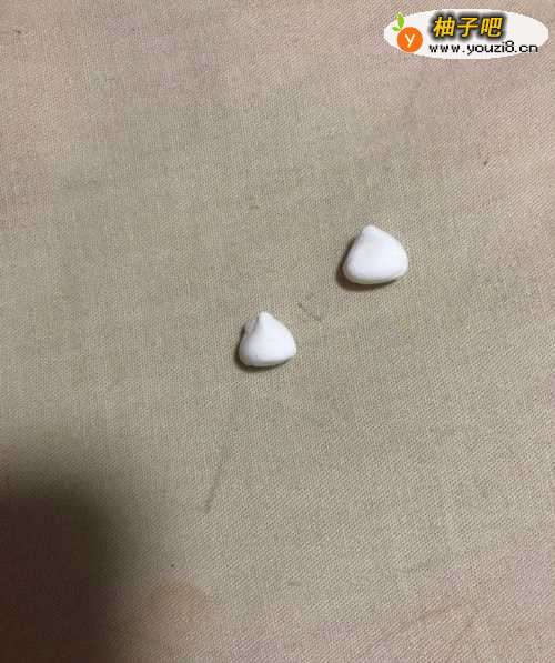 3在拿出白色的彩泥揉成两个三角形粘到上面做耳朵,在拿出红色的彩泥揉成扇形,粘到白色耳朵上面。