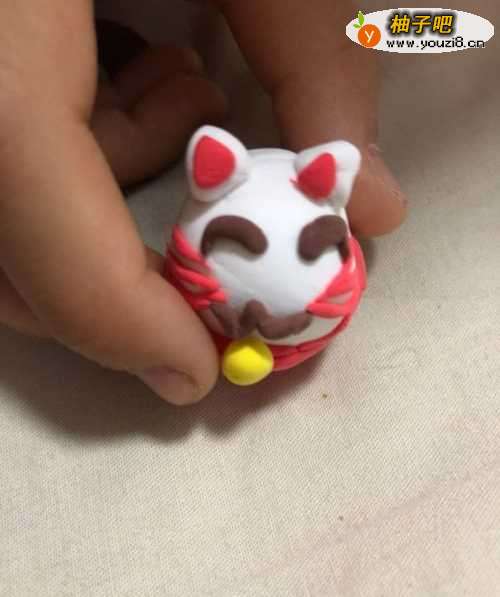 4在拿出灰色的彩泥揉成弯弯的眼眉粘到上面,在拿出红色的彩泥揉成6个小长条,粘到两边做胡须。在拿出灰色的彩泥揉成两个小长条连接成倒3粘到下面。