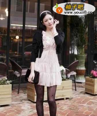 1第一款,淑女的淡粉色连衣裙,跟黑丝袜一起穿,更带着妩媚,而其皱褶的设计则更显女人味。再搭配一件黑色超短外套,两者深浅结合,很是优雅。