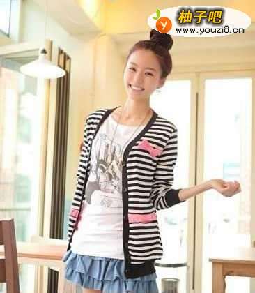 7第四款,黑白条纹,永远的经典,白色图案T恤,还有层叠的蛋糕短裙,这一个混搭很有层次,也很可爱。8
