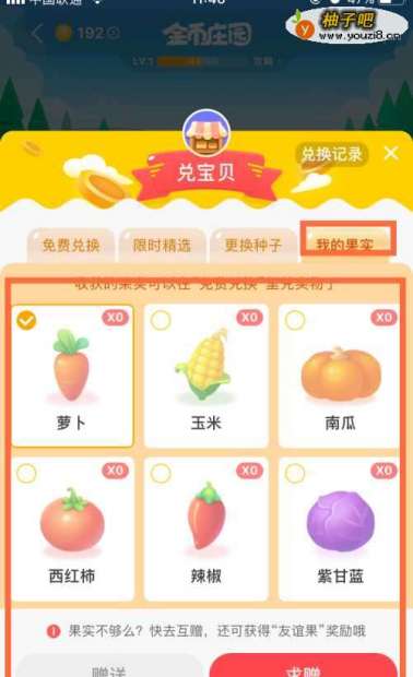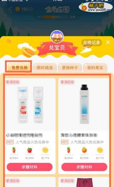 4点开以后,就能看见可以“免费兑换”的宝贝,完全是用种出的果子来兑换的,如下图。