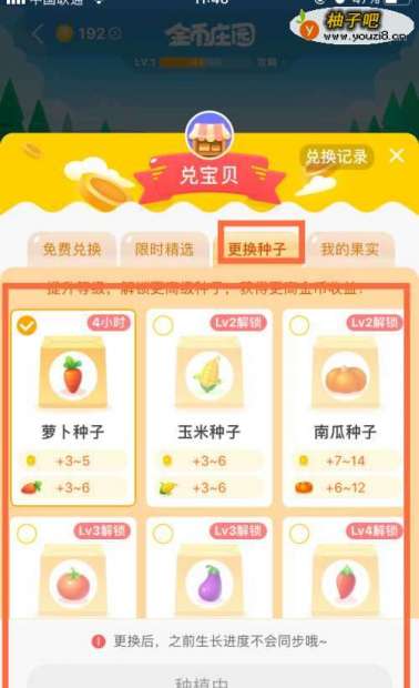 6“更换种子”,可以将当前生长中的植物更换成其他种类,比如从玉米变成南瓜,这样就可以得到不同种类的果实,方便你凑数了。