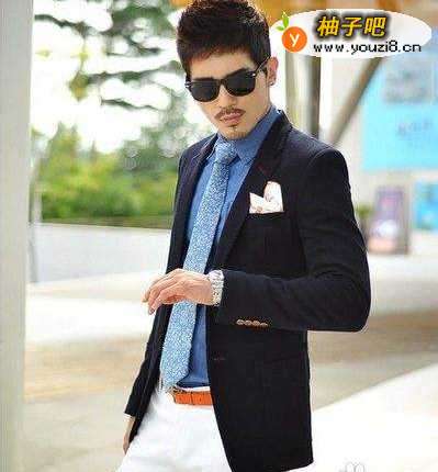 深蓝色作为合身外套,搭配白衬衣,会让人显得神秘浪漫,又不失庄重,最适合出现在一些正式的场合。可不要以为这种搭配,会让人觉得土里土气的,其实如果在服装面料上夺下点功夫,这种搭配绝对可以让你得到意想不到的结果。推荐搭配:纯棉蓝色斜纹不料的修身西装+白色长裤,更讲究一点的人士,还可以在胸前口袋放一条白色的手帕。