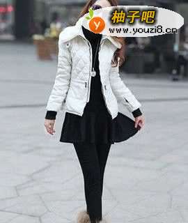 搭配三:白色短款面包服+黑色针织短裙黑色针织短裙也是我们秋冬季必备的一款单品,百搭显瘦又非常舒适,搭配这件白色短款面包服也是非常显气质的。