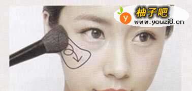 6用画圆的方法,从眼尾到颧骨,轻刷带有珠光感的珊瑚色腮红。