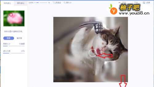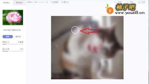 7点击鼠标左键,然后一直拖动圆圈,把不需要虚化的地方都拖一片,这样图片的背景虚化了。然后点击右下角的保存与分享。