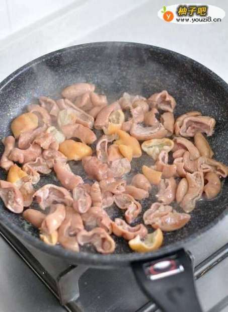 3煎至肥肠出油,肥肠颜色金黄后盛出,锅里留底油。