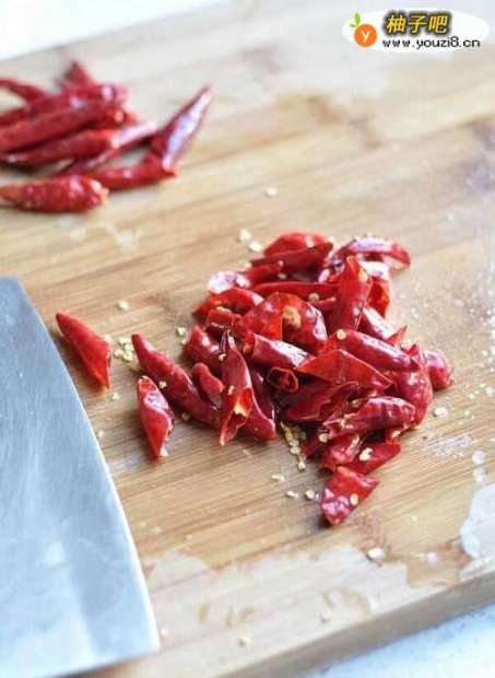 4倒入姜条葱段小火炒香,加入辣椒、麻椒。