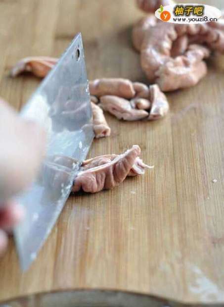 2肥肠自中间剖开后切段,把切好的肥肠倒入锅里,开小火煎制。
