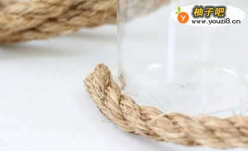 3第三步:继续将麻绳缠绕固定在玻璃杯表面,直到麻绳完全覆盖玻璃杯为止。