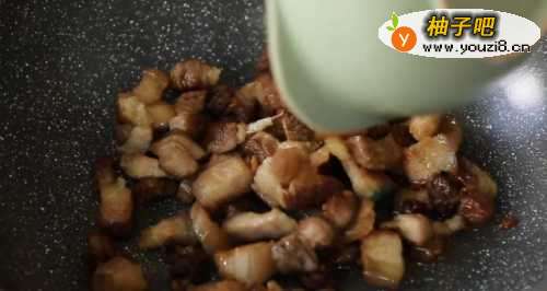 33、底油不要倒,把肉放在锅里煎,逼出肉本身的油。放入八角、香叶、姜炒香。先烹入几滴醋翻拌(千万不要多了),然后烹料酒翻拌、最后放生抽和老抽上色。