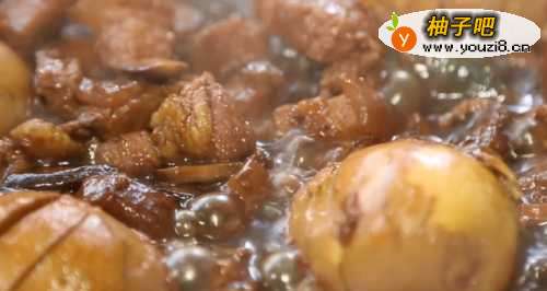 44、倒入香菇和冬笋翻炒后锅里倒开水。放几粒冰糖,把鸡蛋、洋葱放进去一起炖煮。