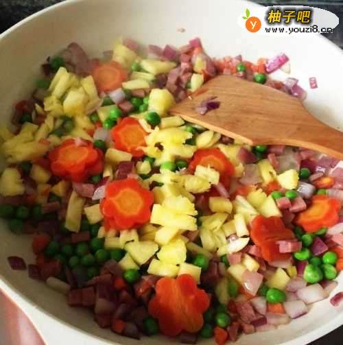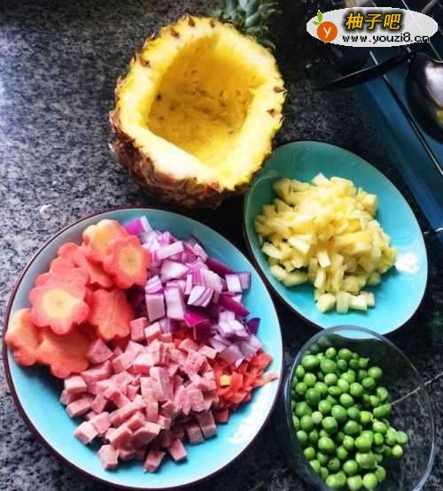 2菠萝挖出切丁,胡萝卜切丁或花样,洋葱和火腿切丁,豌豆和花样胡萝卜焯熟。