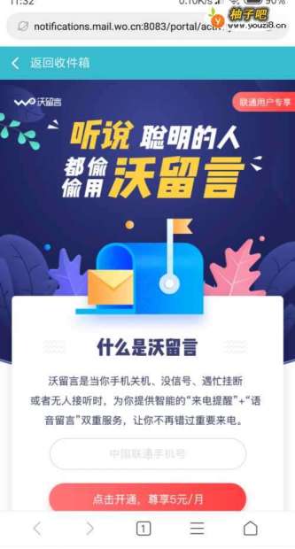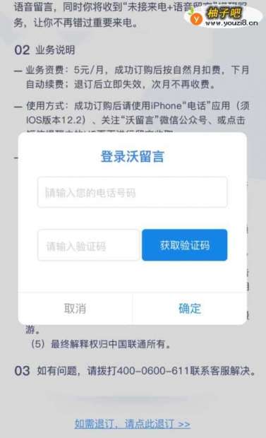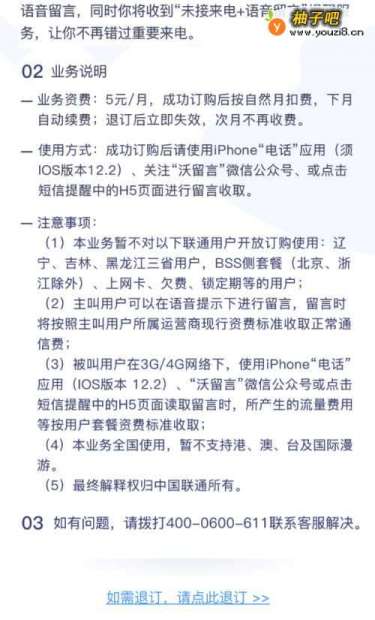 在IPhone手机端已激活语音留言功能的用户,将收到订购提醒短信,需要订购业务的用户,点击短信中的链接地址进入H5订购页面。